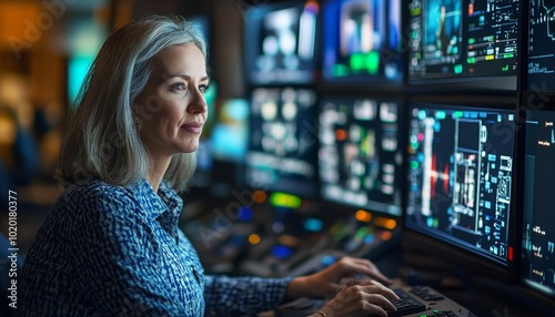 middle-aged, woman, high technology, technology, screen, monitor, sharpened, concentration, workplace, engineer, technician, operation, monitoring, security, innovation, career, business, digital, technical, electronic, safety, surveillance, corporate environment, indoor, work, businesswoman, management, leadership, operational, high technology, computer, datum, information, industry