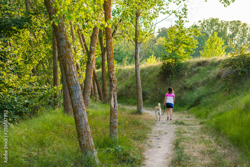 pet, dog, nature, mountain, animal, mammal, leg, road, casual attire, exercise, mutt, rural, green, domestic, caucasian, sun, 2, leash, rest, outdoors, female, dirt, leisure, sport, park, young, people, shirt, woman, relax, together, idylli, hound, country, adult, grass, friends, track, tall, playing, meadow, weekend, summer, countryside, evening, girl, autumn, labrador, walking