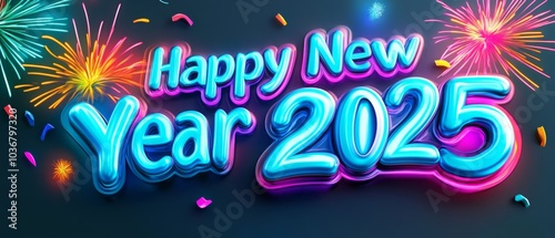 midnight happy new year 2025, with sparkling colorful fireworks bursting in the sky, black background.