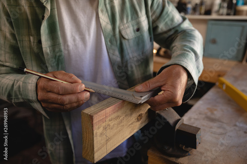 Midsection of carpenter using graduated square on wooden plank in workshop