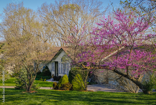 yard, house, suburb, redbud, bloom, spring, tree, landscape, midwest, pink, blossom, season, sky, nature, colours, tree, flower, blue, blooming