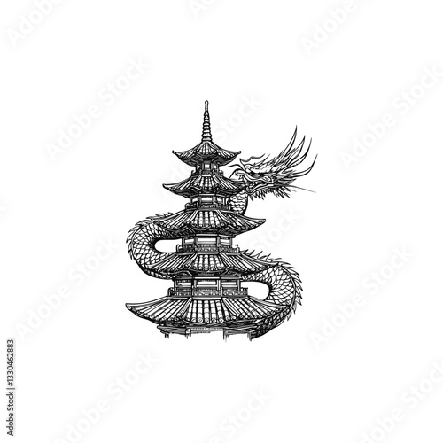 pagoda, traditional, meditation, culture, decorative, tour tourism, travel, design, symbol, religion, dragon, asia, art, fantasy, architecture, roof, animal, siam, antique, heritage, buddhism, temple, religious, oriental, holiday, building, chinese, style, sky, serenity, pray, asian, historic, landmark, peaceful, holy, coil, vector, illustration, japan, mighty, ink, poster, ancient, isolated, silhouette, t-shirt, palace
