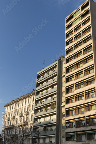europa, italy, lombardia, milan, architecture, balcony, building, city, city landscape, colours, day, exterior, facades, house, march, photo, plant, pot, potted, restored, sunny, urban, window, winter