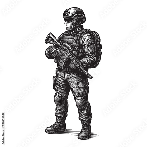 soldier, military, army, tactical, combat, warrior, security, defense, special forces, uniform, weapon, rifle, firearm, gun, helmet, vest, backpack, protection, force, engraving, vector, illustration, black-and-white, hand-drawn, vignetting, line art, isolated, war, conflict, patriotic, hero, armed forces, police, swat, law enforcement, male, strong, resolute, equipment, ready, racked, professional, combatant