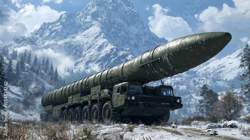 Military truck with massive missile in snowy mountain scene