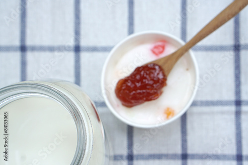 timber, spoon, kitchen utensile, sweet, dessert, jam, strawberry, milk, jar, bottle, glasses, ice cream, ingredient, fabric