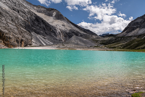 Milk lake in Yading Nature reserve. Daocheng Yading Natural Reserve Scenic Area consists of three holy snow mountains, namely Xiannairi, Jiangbianyang and Xianaduoji, and surrounding rivers, lakes