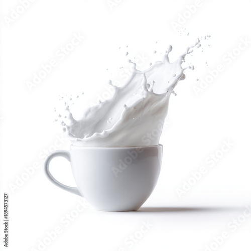 Milk splash, ceramic cup, white background, clean, isolated, dynamic motion, fresh