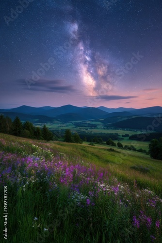 milky way, mountain, vale, wildflower, foreground, night, landscape, scenic, view, sky, star, galaxy, field, grass, hill, tree, forest, dusk, twilight, meadow, summer, nature, purple, green, cloud, horizon, astronomy, cosmos, universe, space, darkness, light, beauty, peaceful, serene, calmness, rural, countryside, environment, travel, destination, tour tourism, vacation, panorama, vista, idylli, pristine