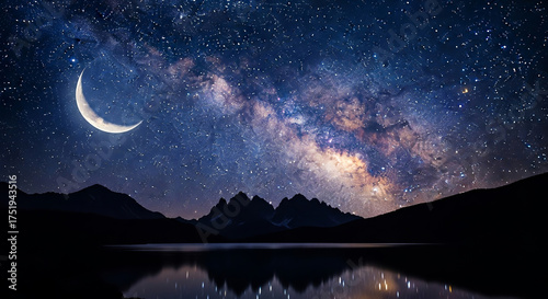 night sky, milky way, crescent moon, star, mountain, galaxy, astronomy, serenity, nature