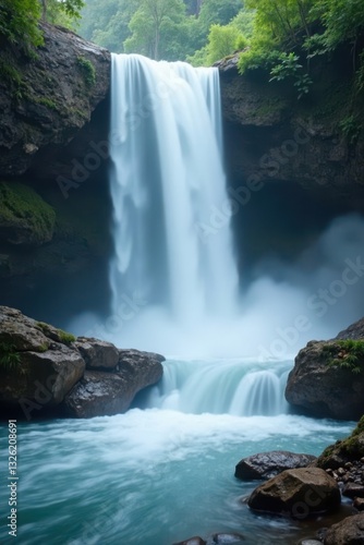 Milky white waterfall, slow shutter speed captures ethereal flow , design, flowing