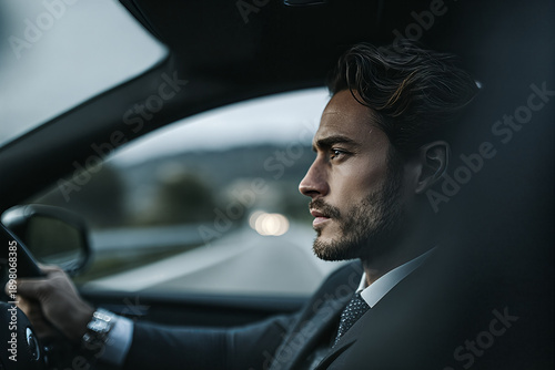 businessman, european, man, suit, charcoal, attaching, dotted, beard, stubble field, wristwatch, driving, car, profile, sideview, focused, serious, thoughtful, highway, dusk, evening, headlamp, bokeh, interior, luxury, commute, executive, professional, collar, seat, concentration, road, motion, guard rail, landscape, moody, corporate, travel, confident, environmental, portrait