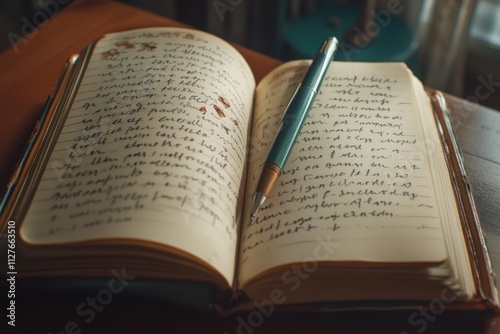 Millennial writing in gratitude journal captured during soft morning light, with copy space