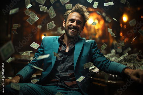 Millionaire's Success. Businessman Making Money Rain While Seated. AI Generative