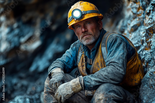 Miner resting determination safety equipment industrial background coal mine rugged environment resilient expression