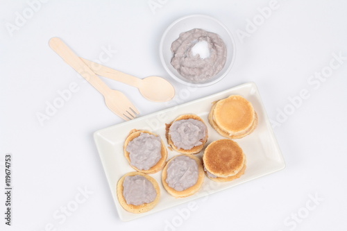 battercake, mini, stirred, taro, dessert, sweet, sirup, circle, yellow, fried, flour, coconut, children, children, baby food, snack, pan, party, food, cooking, topped, health, taste, soft light, fork, spoon, eatery, scramble, joyful, fun
