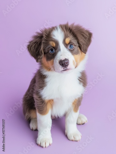 Miniature American Shepherd Puppy: An adorable Miniature American Shepherd puppy with captivating blue eyes and a charming tri-color coat sits attentively against a soft lavender backdrop.