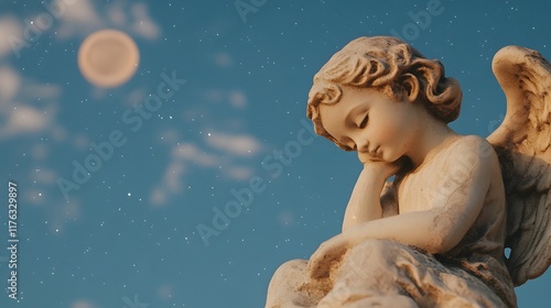 Miniature angel statue with feather wings sitting on a cloud with a night sky in the background, Generative AI