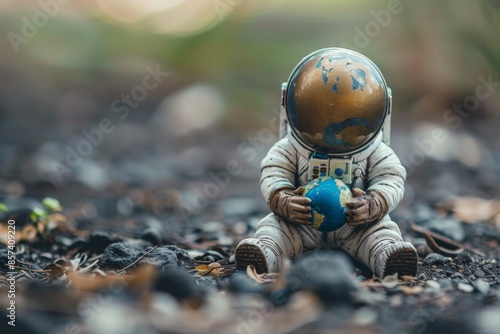 astronaut, miniature, earth, cosmos, space, fantasy, helmet, suit, adventure, exploration, extraterrestrial, science fiction, nature, toy, small, detailed, collectable, model, figurine, childlike, whimsical, surreal, environment, sharpened, ground, dirtied, outdoors, imagination, play, concept, creative, inspiration, science, planet, holding, enchanting, fictional, solitude, mysterious, discovery, universe