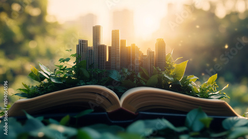 miniature cityscape emerges from an open book, symbolizing imagination, creativity, and the merging of knowledge with the limitless possibilities of the mind