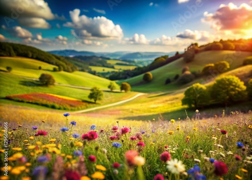 landscape, miniature, photo, scenery, nature, hill, field, flower, rural, countryside, meadow, farm, sun, sky, cloud, green, blue, yellow, spring, summer, autumn, travel, adventure, beautiful, scenic, vista, panorama, view, background, image, photo, picture, art, design, digital, illustration, environment, earth, earth, planet, wide, shot, high, resolution, detailed, high-coloured