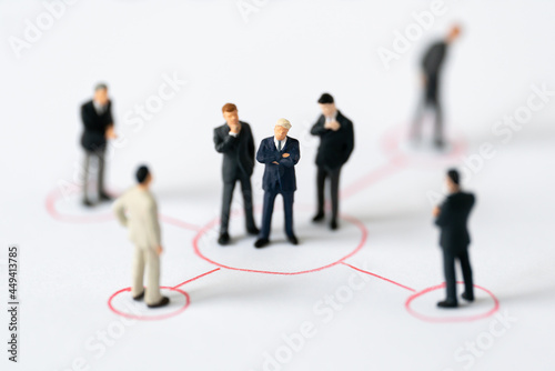 Miniature people Group of Businessman mini figures standing thinking on Graphic Info white background using as Success Business partnership development and Commerce Strategy winning Planning concepts