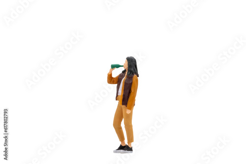 Miniature people Young woman drinking water from bottle isolated on white background with clipping path