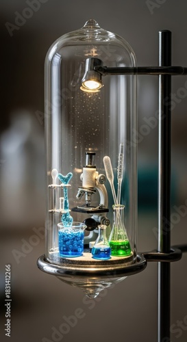 Miniature scientific instruments and colorful liquids contained within a clear glass bell jar under illumination