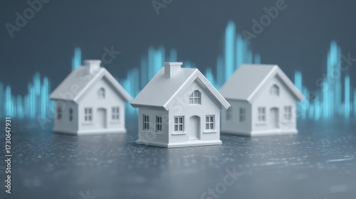 Miniature white houses on a digital background with abstract blue graphs representing real estate trends and economic growth in the housing market