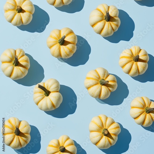 Miniature white pumpkins pattern on light blue background with shadows