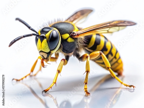 yellow jacket, wasp, insect, macro, photo, miniature, isolated, white background, closeup, detail, nature, wildlife, bug, hymenoptera, animal, fauna, zoology, image, hi-res, background, white, sharpened, sharp, blurred background, high-quality, realistic, detailed, studio shot