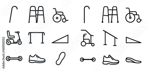mobility, cane, walker, wheelchair, balustrade, ramp, clean, icon, black, icon, outline, linear, flat, simple, minimal, line, graphic, vector