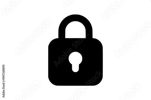 Minimal flat vector icon of a black padlock with a key beside it, simple security symbol, bold solid shapes, white background, clean modern icon style, high contrast, centered composition.