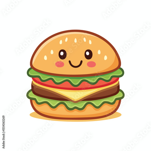 Minimal Flat Vector of Cute Burger with Bold Black Outline and Happy Expression, No Gradients
