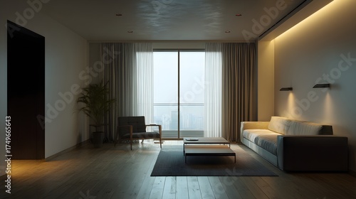 Minimal living room render with balanced soft lighting