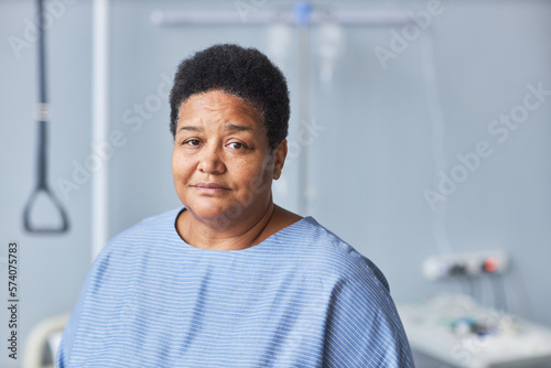 Minimal portrait of black senior woman looking at camera in hospital room, copy space