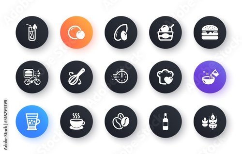 Minimal set of Burger, Cooking whisk and Food delivery flat icons for web development. Love cooking, Ice cream, Frappe icons. Peas, Water glass, Coffee beans web elements. Peanut. Vector