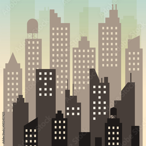 Minimal vector cityscape with high-rise buildings under a soft gradient sky. Perfect for urban themes and modern design concepts.