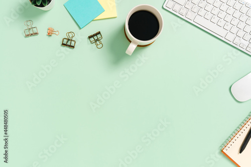 Minimal work space - Creative flat lay photo of workspace desk. Top view office desk with keyboard and mouse on pastel green color background. Top view with copy space, flat lay photography.