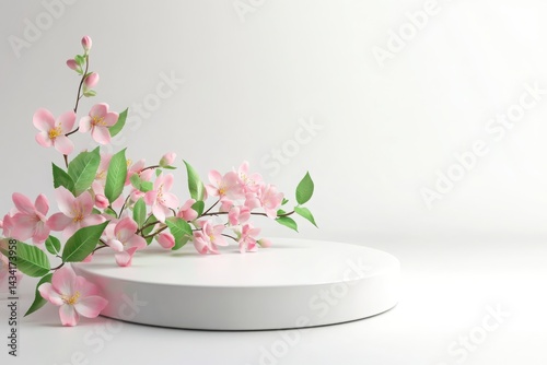 Minimalist 3D Podium with Spring Flowers and Green Leaves on White Canvas.
