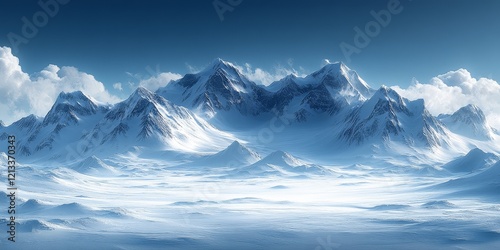 ice, snow, mountain, landscape, snowy, white, three-dimensional, rendering, minimalist, perspective, cold, nature, clear sky, blue, smooth, pure, flat, winter, cartoon, hi-res, distant, clean, atmosphere, snow-capped, snowflake, scene, icy, background, model, simple, digital, winter landscape, graphic, outdoors, glacé, environment, fresh, untouched, serene, remote, high-quality