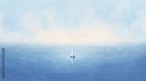 minimalist abstract illustration of a lone sailboat in wavy blue sea with ethereal dreamscapes art style, generative AI