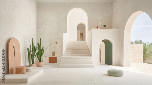 interior, modern, design, minimalist, architecture, home, decor, living, room, stair, arch, light, neutral, beige, cream, pale, empty, space, plant, cactus, wood, accent, furniture, texture, calm, peaceful, simple, contemporary, house, elegant, clean
