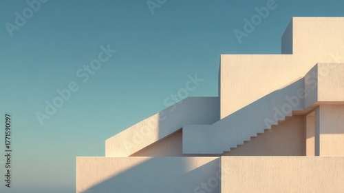 minimalist, construction, geometry, abstract, facades, building, architecture, stair, step, exterior, wall, cream, beige, pastel, tone, shadow, light, sun, sky, blue, clear, structure, modern, contemporary, line, angle, shape, graphic, design, fragment, detail, clean, simple, nobody, day, bright, peaceful, tranquil, render, perspective, ascent, progress, urban, background