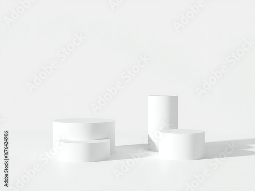 Minimalist arrangement of white cosmetic jars and containers on a white background