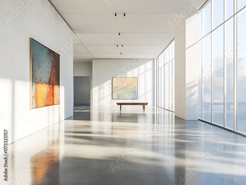 Minimalist Art Gallery with Abstract Paintings Displayed in a Modern Exhibition Setting Featuring a Visitor Admiring a Vibrant Artwork