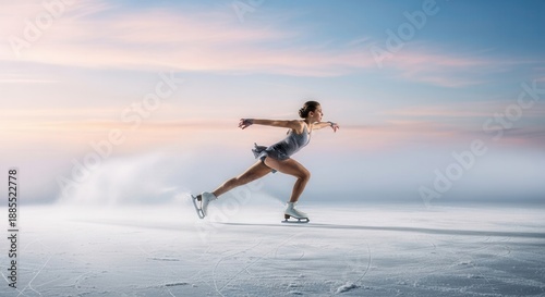 minimalist athletic portrait of a figure skater in a dynamic forward glide across a clean white ice surface with subtle snow spray.