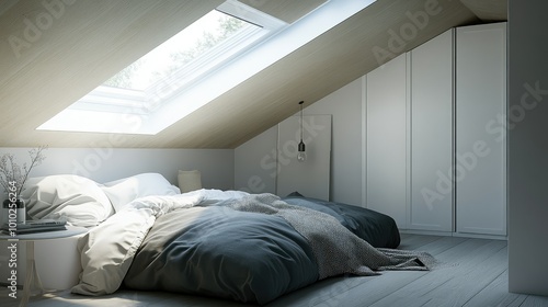 apartment, home, attic, ceiling, skylight, interior, design, house, window, room, light, bedchamber, white, space, modern, minimalist, style, building, wall, indoor, architecture, roof, frame, inside, floor, daylight, bright, table, mansard, nobody, loft, construction, empty, residential, contemporary, wooden, wood, cosy, slanted, new, decoration, pillow, bedding, view, bed, linen, europa, background, black