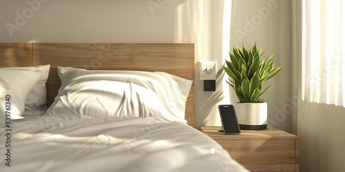 Minimalist Bedroom: Clean and simple bed with a modern smartphone and a plant on the nightstand.