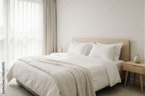 bedchamber, bed, blanket, pillow, bedding, white, wooden, headboard, minimalist, modern, cosy, soft, comfort, relaxation, interior, home, decor, natural light, window, curtain, nightstand, vase, clean, fresh, peaceful, inviting, tranquil, serene, simplicity, contemporary, stylish, elegant, uncluttered, restful, sleep, morning, sunlight, bright, neutral, calm, apartment, domestic, furniture, sheet, high fidelity, up high, neat, organised